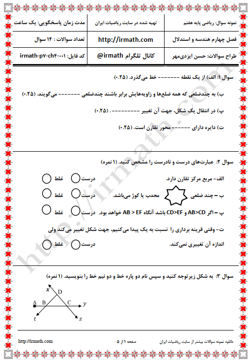 نمونه سوال ریاضی پایه هفتم فصل چهارم هندسه و استدلال- فایل word شماره ۱