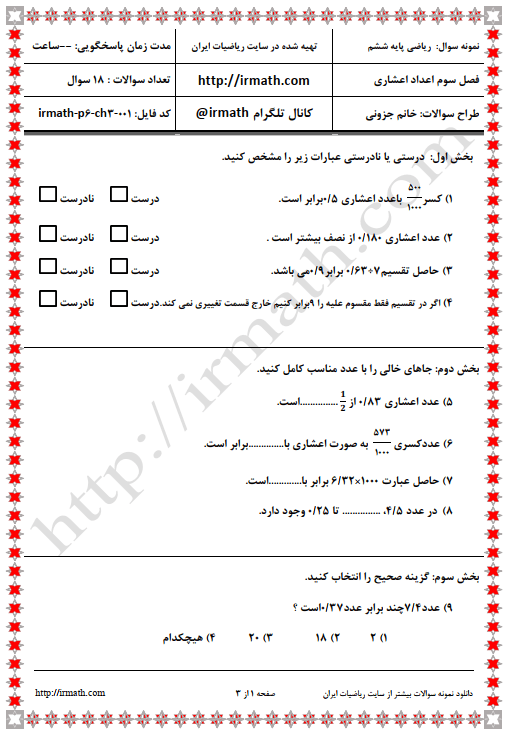 نمونه سوال ریاضی پایه ششم فصل سوم اعداد اعشاری- فایل word  شماره ۱