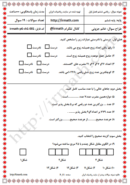 فایل نمونه سوال ریاضی پایه ششم ابتدایی فصل اول به صورت ورد قابل ویرایش برای دبیران عزیز