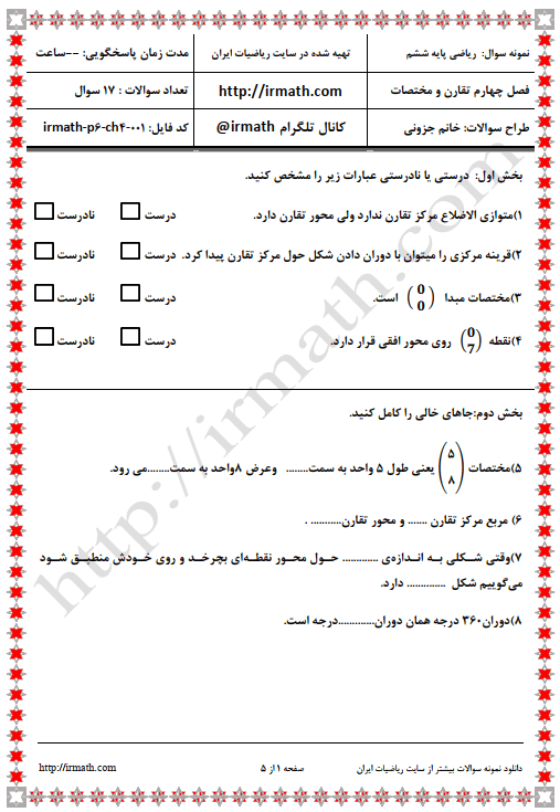 نمونه سوال ریاضی پایه ششم فصل چهارم تقارن و مختصات - فایل word شماره ۱