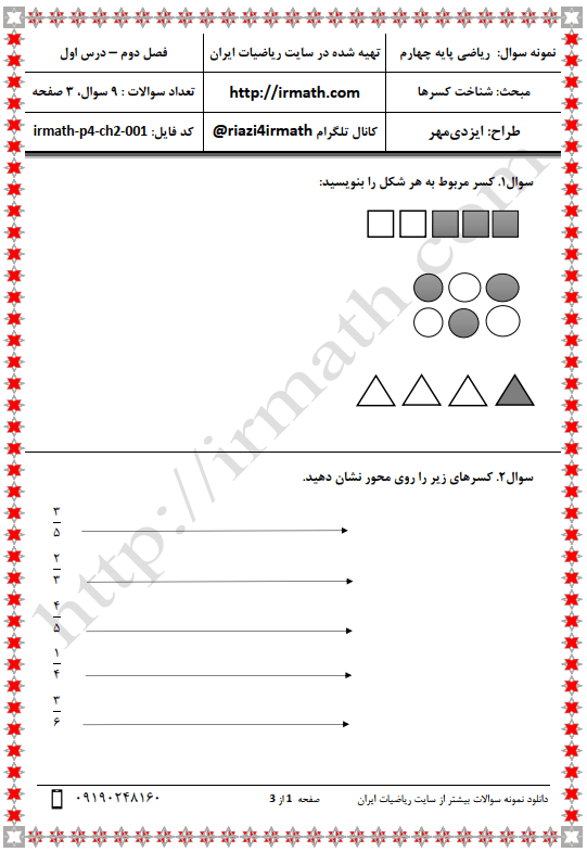 فایل ورد(word) شماره ۱ سوالات ریاضی پایه چهارم فصل دوم درس اول شناخت کسرها