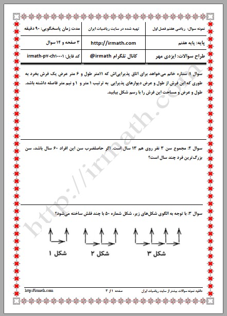 نمونه سوالات ریاضی پایه هفتم فصل سوم شماره ۱ فایل pdf رایگان